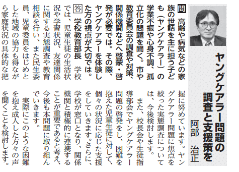 実際にヤングケアラーの事を議会が取り上げている方は令和元年5月15日の流山議会だよりに載っている阿部正治さんしかいませんでした。