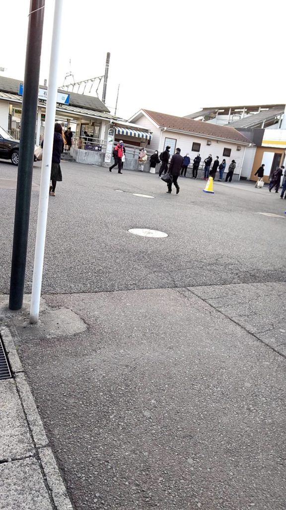 初石駅の行列 スロープ側に約4,50人が列を作っております。