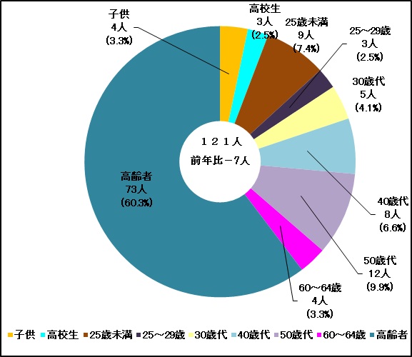 一方、高齢者の事故による死亡者数は約60%となっており、25歳未満を入れた数の16名と比較しても