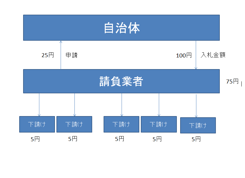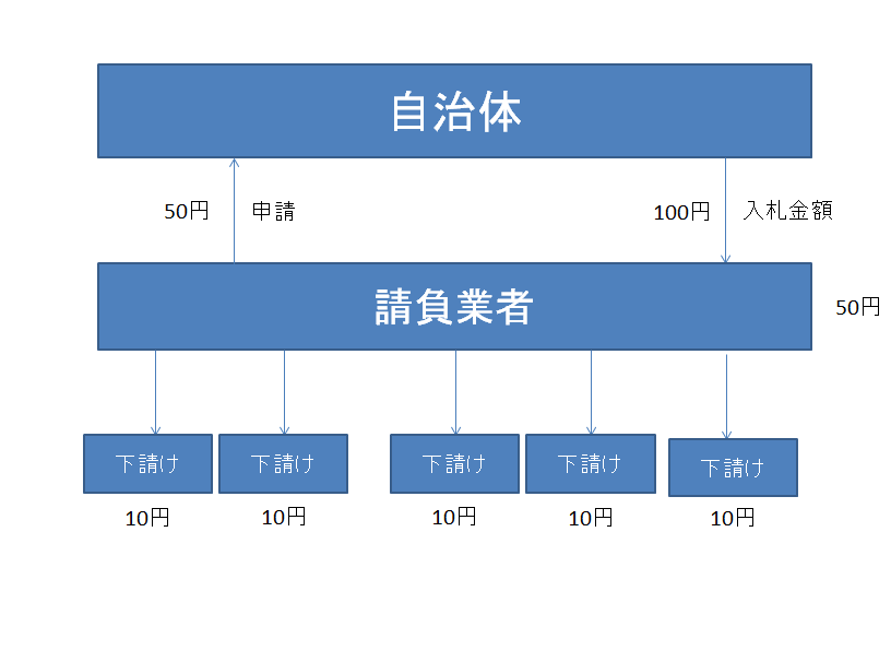例えば、入札金額100円の公共事業に対して下請け5社に10円ずつ支払うという契約であれば