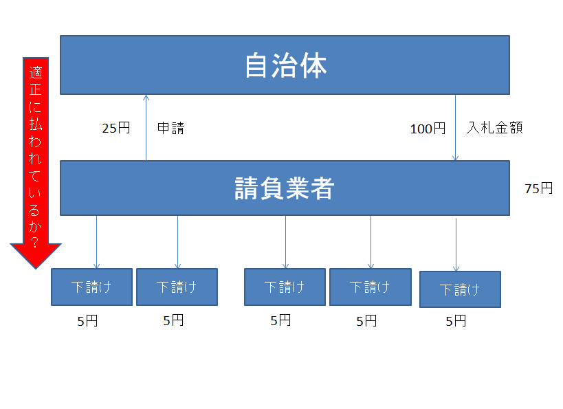 このような状況の自浄作用として、自治体は下請け業者に対して「適正に下請け代金が支払われているか」という
