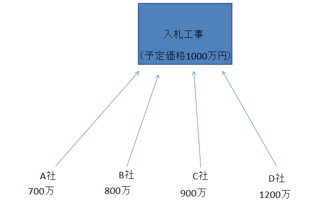 例えば、最低落札価格が850万円の場合、A社とB社は最低落札価格以下のため入札は失格となり